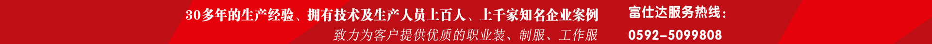 廈門富仕達(dá)服飾有限公司為專業(yè)工作服廠服職業(yè)裝制服32年!公司集設(shè)計(jì),生產(chǎn)加工,售后為一體的專業(yè)職業(yè)裝公司,歡迎同業(yè)來料加工。電話:0592-5099808。富仕達(dá)職業(yè)裝已成為多家知名連鎖企業(yè),跨國公司及上市企業(yè)等專業(yè)服裝外包商。